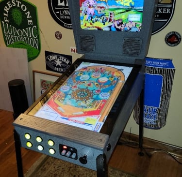 These machines sport a 24" playfield and a 15" 4:3 back box monitor. I designed and built this cabinet aiming towards a more discerning crowd that appreciates a stylish design that can blend in into a sophisticated, tasteful setting. The dual trapezoidal shaped back box is a nod to the older style Gottlieb Wedge-Head design that was popular in the 1960’s and 1970’s, strongly accented with a ‘Streamline Moderne’ design. Every feature has been carefully thought out, from the custom grillwork to the beehive cover on the ball shooter. These cabinets are form first, function second. They are fixtures of stylish art and not a loud or gaudy arcade game that will end up in a yard sale.